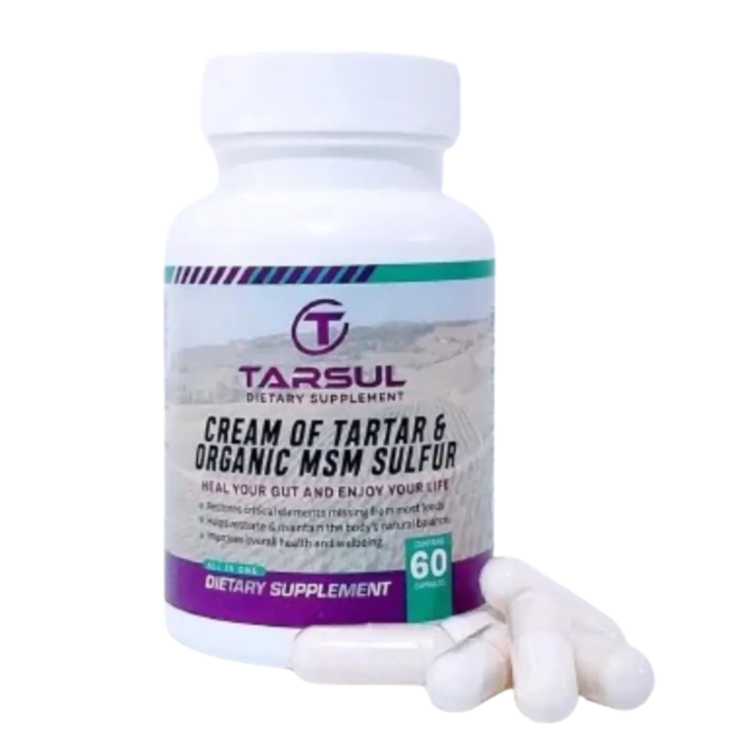 Tarsul is a powerful dietary supplement made only with natural Cream of Tartar (potassium bitartrate) and organic MSM sulfur - two ingredients used since the early 1900s - now brought back in a convenient daily supplement.